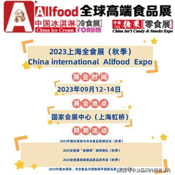 1.展會基本信息 時間:2023年9月12-14日 地點:國家會展中心(上海)展館(上海市青浦區崧澤大道333號) 展館:1.1、2.1號館 預計展會規模:8萬平方米,約1200家展商 預計觀眾:120000人次 展位申請:18601736437 蔣先生 上海,作為一個全球化大都市,美食文化自然也是十分豐富多彩。而在這個美食的天堂,Allfood2023上海全食展無疑是一個讓人垂涎欲滴的盛宴。